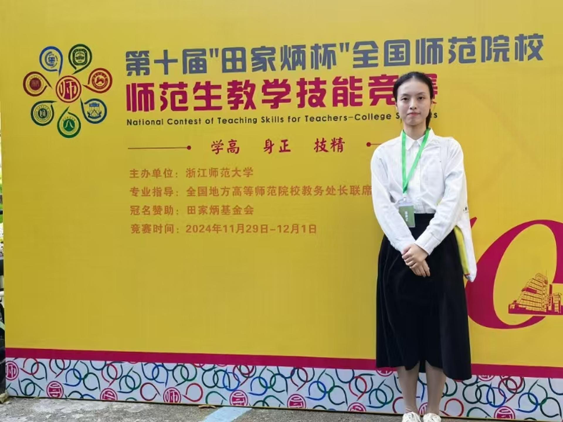 12月1日,2024年第十届“田家炳杯”全国师范院校师范生教学技能竞赛在浙江师范大学落下帷幕,我院数学与应用数学(师范)专业本科生毛馨夷同学喜获数学与应用数学组一等奖。