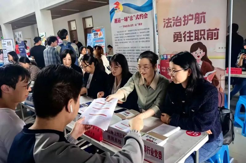 学院合作共建单位——南通市崇川区司法局与崇川区律师行业党委在招聘会现场开展“法治护航 勇往职前”公益法律服务活动。崇川区司法局协同律师、公证员设立法律咨询服务台,发放“大学生求职风险防范小TIPS”,解答就业、升学、留学、创业等方面涉法相关问题。围绕应届生编制内容、公务员笔试面试要点、公证员、律师职业规划等话题,与学院师生们进行了深入浅出的互动式讲解。
