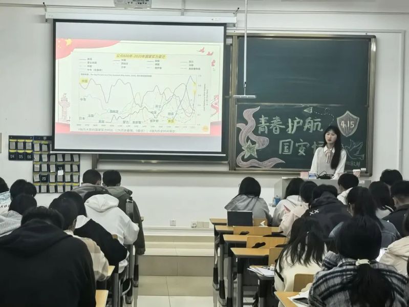 班级团支书通过动态图表展示我国GDP增长、航天技术突破等发展历程,结合数据分析指出国家安全与经济社会发展的紧密联系。同学们从曲线变化中直观感受国家砥砺前行的奋斗足迹,深化“国家安全是发展基石”的认知。