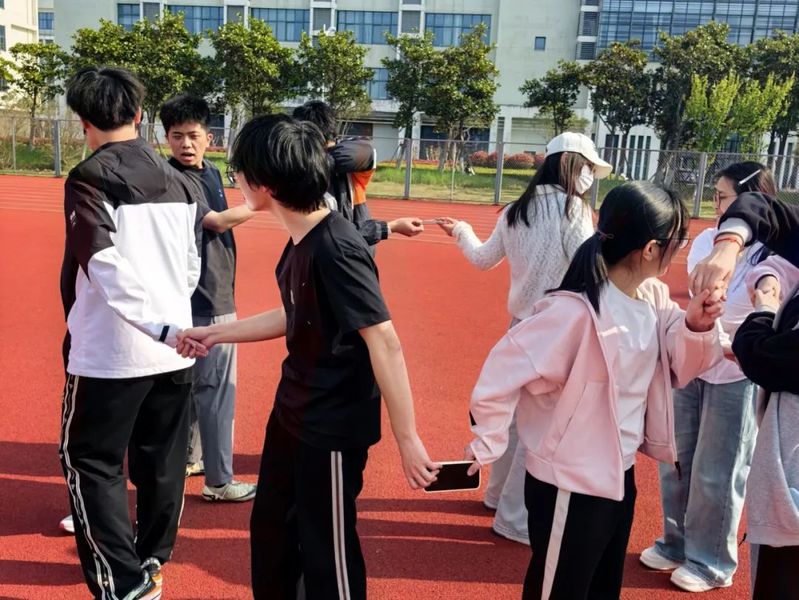 在游戏环节,同学们分为四组,各小组成员手挽手相互连接,构建出环环相扣的“手链”结构。面对错综复杂的牵手状况,同学们沉稳冷静,集思广益,共同探讨解开的最优策略。