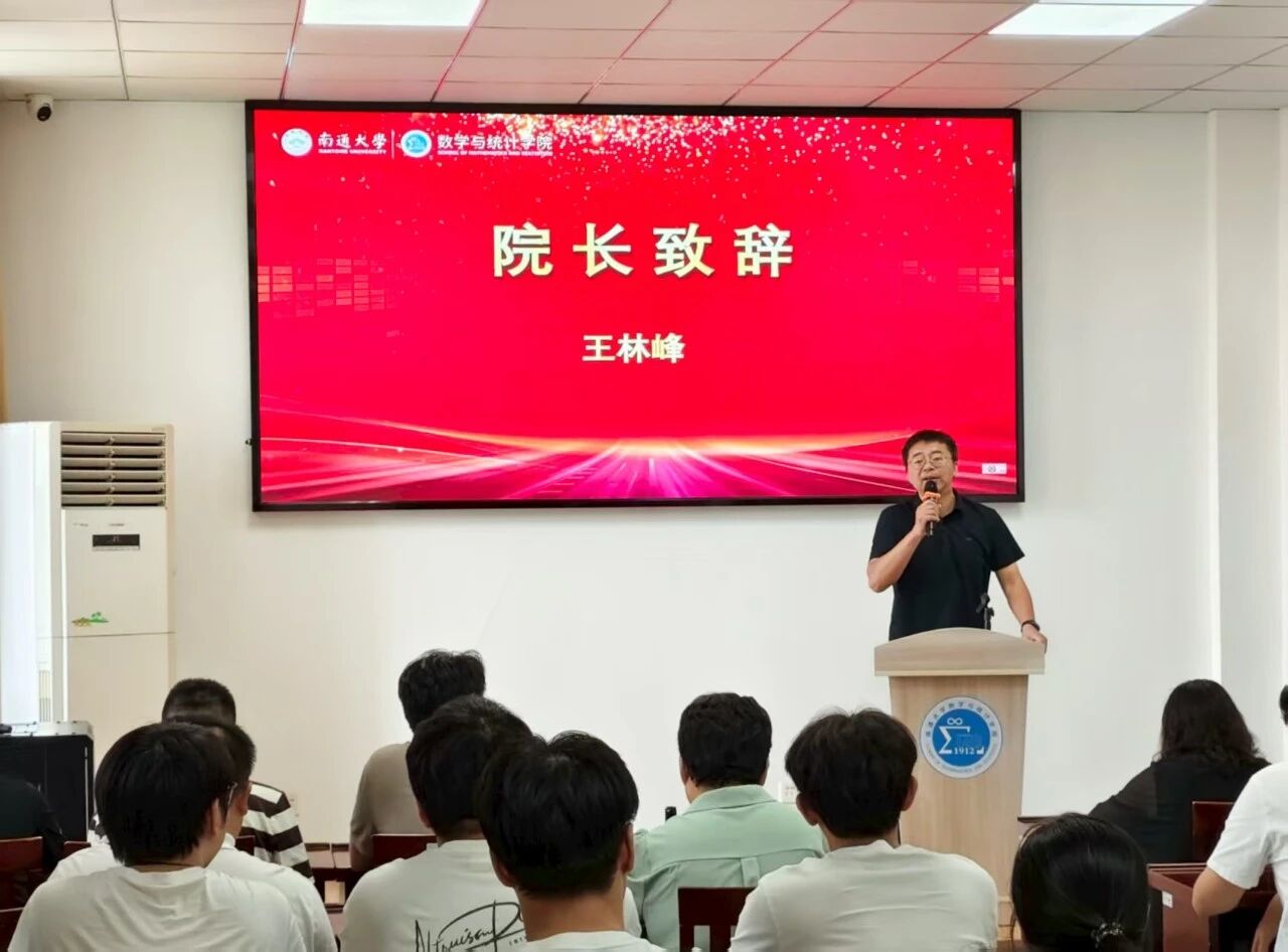 院长王林峰首先向 2025 级全体研究生新生表示热烈欢迎,并围绕学院发展历程、学科特色、科研成果等展开介绍,让新生对学院有了更全面的认识。同时,他寄语新生:要树立远大理想与志气,读研不应仅以就业为单一目标,更要钻研数学与统计学科的精髓,勇攀学术高峰,争取读博深造;“勤奋”是研究生阶段的核心品质,希望大家在学科领域深耕,以积极进取的姿态收获优异成绩。