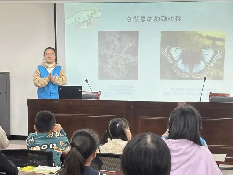 有趣的科普活动从“轴对称”开始。PPT中展示了自然界中雪花的六边形对称、蝴蝶翅膀的图文对称,再到庄严的轴对称建筑和精巧的日常用品。志愿者们讲解道,轴对称不仅带来和谐统一的美感,更赋予了建筑结构稳定性,让孩子们感受到数学无处不在的实用与美学价值。