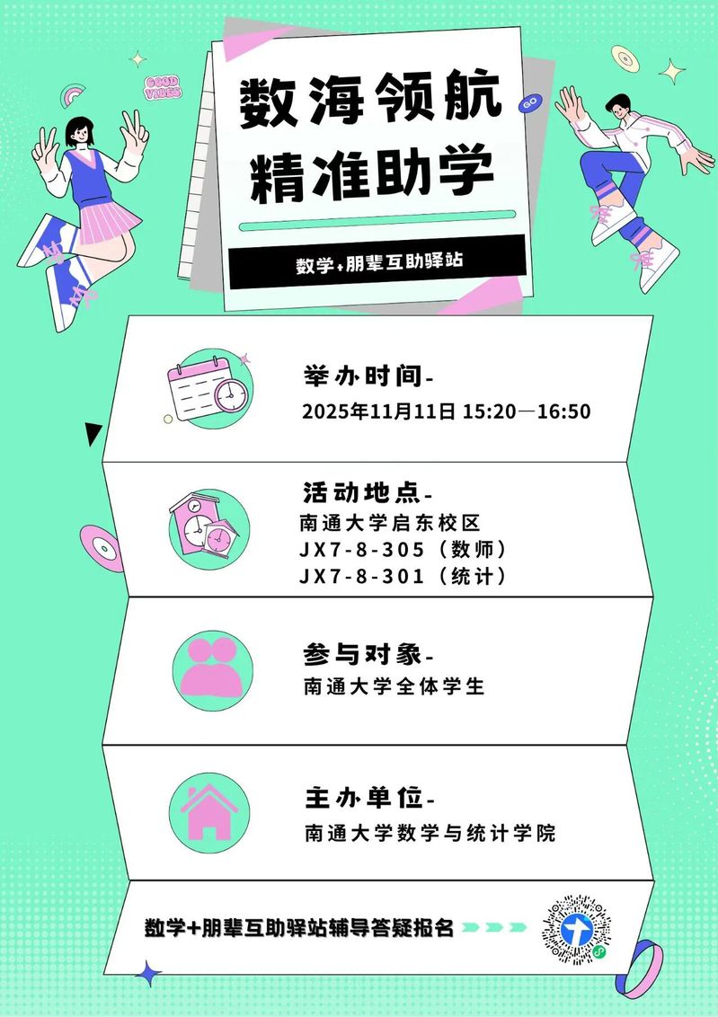 我们是?“数海引航,精准助学”是由数学与统计学院匠心打造的互助成长平台,旨在通过“学子助力学子”的创新模式,构建一个开放、温暖、高效的学习生态共同体。 这里集结了学院最优质的学生力量,为各年级同学提供全方位、深层次的学业赋能。在这里,不仅有专业课程的答疑释惑,还有竞赛领航、升学交流、学习经验分享等多元内容。通过“一对一帮扶”“小组研学”“专题研习坊”等灵活形式,我们致力于打破独自学习的疏离感,让数学学习变得更有温情、更富实效。 无论是基础待强的同学想要夯实基础,还是学有潜力的同学渴望突破自我,都能在这里找到志同道合的学伴和适配的成长路径。让我们以数学为纽带,在互助共进中携手成长,让每个人都能在互助同行中收获属于自己的成长亮色!