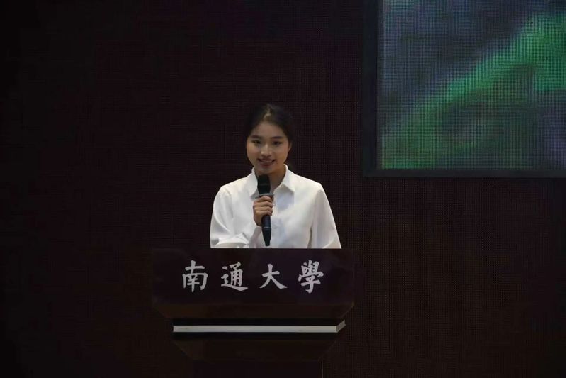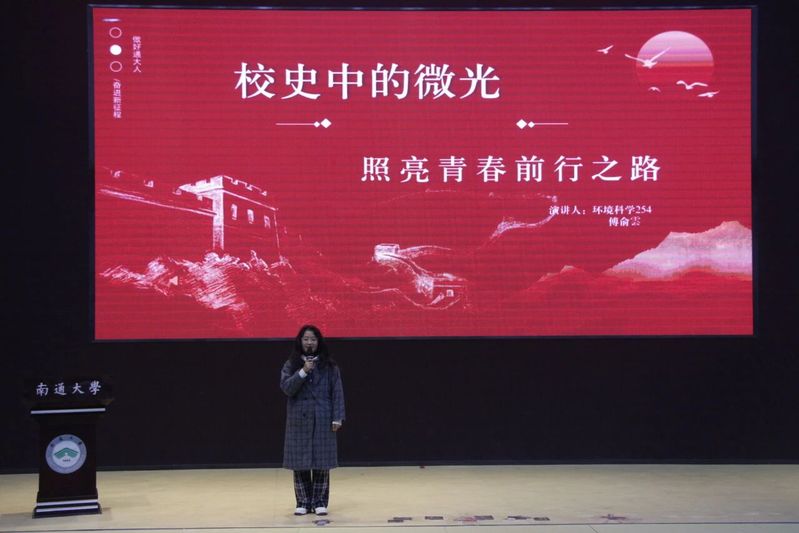环境科学254傅俞雲饱含激情,语气铿锵,通过张謇“变卖祖产、南洋募捐”、不同时期通大人的具体行为,将抽象的“校史精神”转化为可感知的案例,结尾更是结合新生身份号召行动,让校史从“历史叙事”转化为“当代青年的实践指引”。