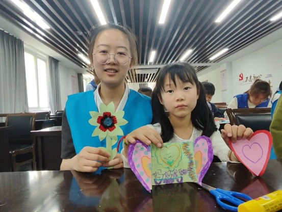 在手工制作过程中,志愿者们通过“趣味互动”,向孩子们讲述母亲节的由来和意义,引导他们学会表达爱与感恩。“妈妈最喜欢什么颜色?”“你想对妈妈说什么?”……在轻松愉快的问答中,孩子们踊跃分享自己对妈妈的感谢和祝福。