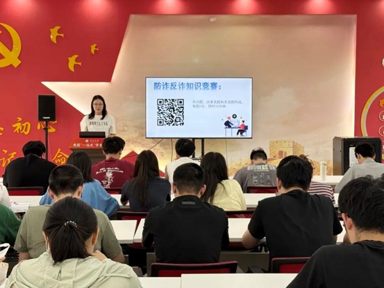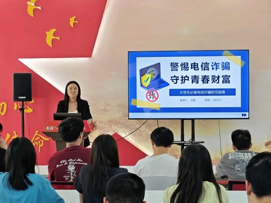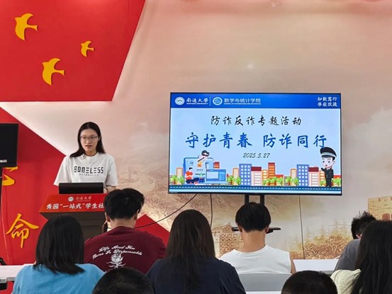 为深入贯彻落实高校法治教育和反诈宣传工作,增强在校大学生对电信网络诈骗的识别能力和自我保护意识,2025年5月27日下午,南通大学数学与统计学院在秀园“一站式”学生社区举办“守护青春,防诈同行”防诈反诈专题活动。
