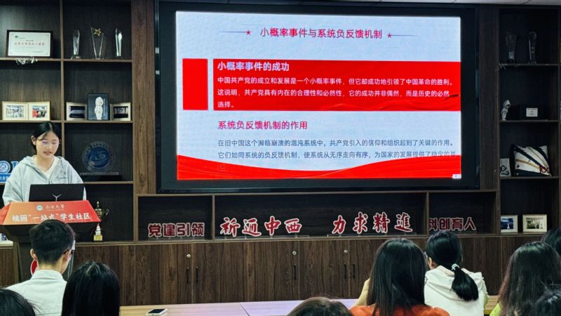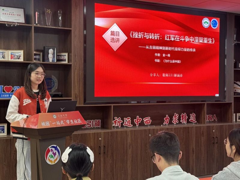 吴蕊同学在分享中指出,《为什么是中国》深刻揭示了中国共产党成功的核心密码在于同时具备了"灵魂"与"旗帜"——即坚定的理想信念和严密的组织体系。她认为这一宝贵经验在新时代依然具有重大意义:理想信念是引领我们前行的精神导航,组织纪律是实现目标的重要保障。作为青年学子,我们既要筑牢信仰之基,又要注重实践之行,将个人成长自觉融入国家发展大局,用实际行动为民族复兴贡献青春力量。