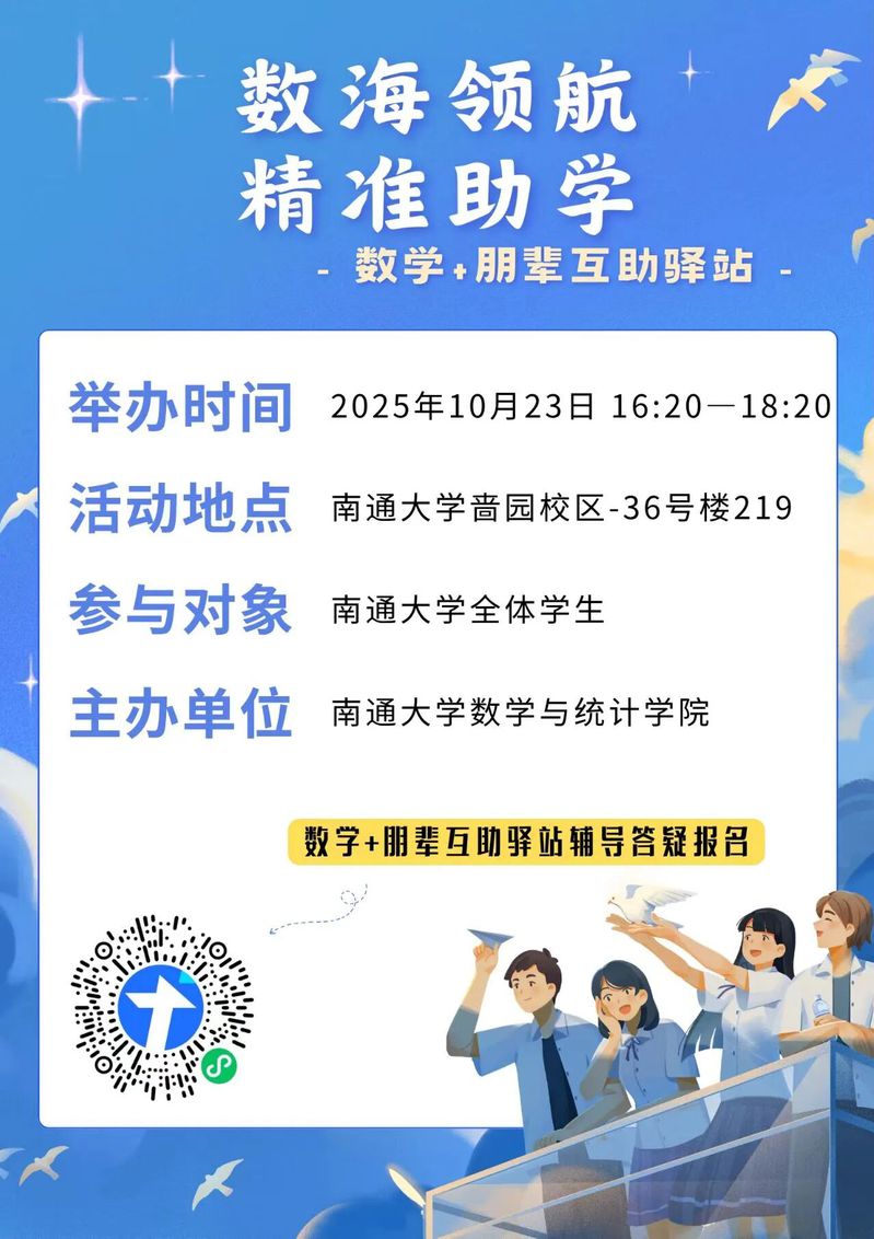 是由数学与统计学院倾力打造的互助服务平台,旨在通过"学生帮助学生"的创新模式,构建一个开放、温暖、高效的学习共同体。在此汇聚了学院最优秀的同学资源,为各年级同学提供全方位、多层次的学业支持。在这里,不仅有专业课程的答疑解惑,还有竞赛指导、考研交流、学习方法分享等丰富内容。通过"1v1辅导""小组研讨""专题工作坊"等灵活形式,我们致力于打破传统学习的孤独感,让数学学习变得更有温度、更有效率。无论是基础薄弱的同学想要夯实根基,还是学有余力的同学渴望突破自我,都能在这里找到志同道合的伙伴和适合的成长路径。让我们以数学为纽带,在互帮互助中共同进步,让每个人都能在集体智慧中收获属于自己的精彩!