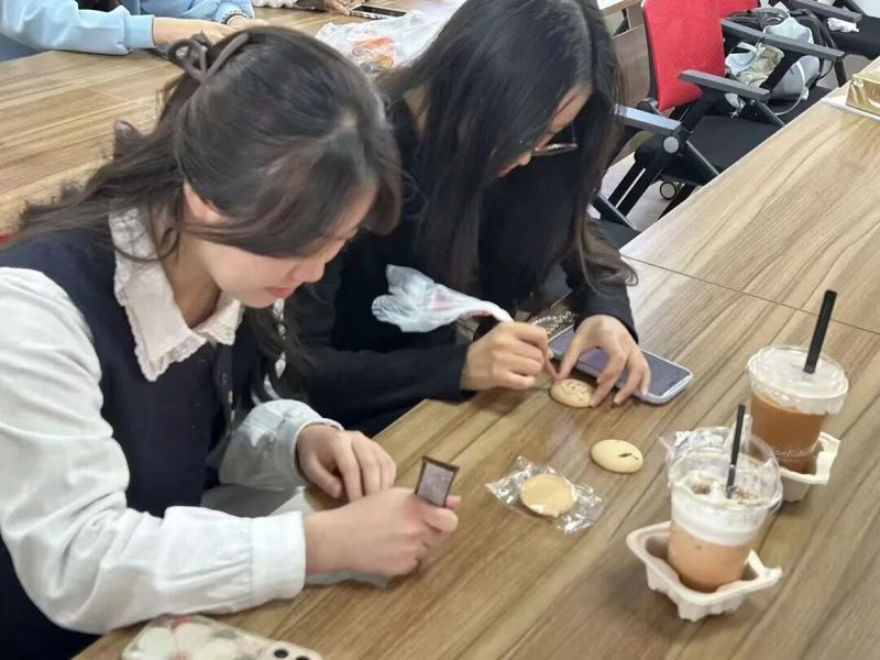活动现场暖意融融,同学们围坐桌前,以圆软饼胚为载体、融化巧克力为“情绪媒介”,沉浸式投入饼干创作。从凝神勾勒星星、笑脸、爱心等图案,到细致填充肌理,同学们暂时卸下学业忙碌与生活烦忧,让创意与情绪自然流淌。创作完成后,大家将亲手制作的巧克力饼干细心打包,递送给牵挂之人——这份“甜蜜”不仅是零食,更承载着可触摸的心理支持,让真挚情感在人际联结中滋养心灵,有效帮助学子释放压力、激活积极情绪。